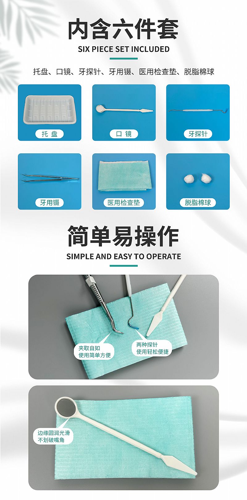 | 补充说明 | 【型号规格】 ZS-1:托盘、口镜、牙探针、牙用镊; ZS-2:托盘、口镜、牙探针、牙用镊、脱脂棉球; ZS-3:托盘、口镜、牙探针、牙用镊、医用检查垫; ZS-4:托盘、口镜、牙探针、牙用镊、医用检查垫、水枪头; ZS-5:托盘、口镜、牙探针、牙用镊、医用检查垫、脱脂棉球; ZS-6:托盘、口镜、牙探针、牙用镊、医用检查垫、脱脂棉球、检查手套; ZS-7:托盘、口镜、牙探针、牙用镊、医用检查垫、脱脂棉球、吸唾管; ZS-8:托盘、口镜、牙探针、牙用镊、医用检查垫、脱脂棉球、检查手套、吸唾管; |