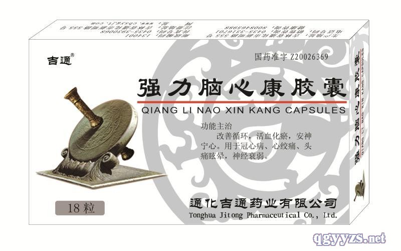 | 补充说明 | 说明书:通用名称:强力脑心康胶囊 汉语拼音:QIANGLINAOXINKANGJIA0nANG 成份:丹参、蜜环菌提取液、蜂王浆。性状:本品为硬胶囊,内容物为棕黄色至棕褐色的颗粒及粉末;味微苦涩。功能主治:改善循环,活血化瘀,安神宁心。用于冠心病、心绞痛、头痛眩晕、神经衰弱。规格:每粒装0.3g 用法用量:口服,一次2粒,一日2次。不良反应:尚不明确。禁忌:尚不明确。注意事项:尚不明确。贮藏:密封。包装:铝塑包装;9粒*2板/盒。有效期:36个月。执行标准:国家药品标准,标准编号:WS—10947(ZD-0947)-2002-2012Z |