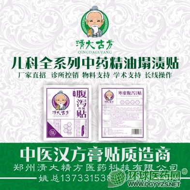 | 补充说明 | 清大古方系列中药精油塌渍贴 一、微分态,吸收快,作用迅速 清大古方精油塌渍贴是由纯中药提取物和中药油制成,无辅料阻滞药物吸收,如热熔胶等,有效成分呈微分态,更容易透皮 吸收; 二、含量高,更有效 清大古方精油塌渍贴每贴含中药提取物和中药油相当于原生药材12-20克,含药量高,更有效; 三、临床经方,现代工艺,疗效验证,**有效 清大古方精油塌渍贴系有经多年临床使用的经方及历代中医名家的经方,经过科研院校再研究的成果转化产品,成品制剂中 充分利用如提取、低温发酵等现代中药制备技术,使药物有效成分更易析出、渗透和吸收,在成方后和成品上市前,以临床 四、经皮给药,操作简单,患儿适从性好 清大古方精油塌渍贴通过贴敷与特定穴位和部位,经皮给药,直达病灶,作用迅速;不经口,无创给药,更易被患儿接受; 六、包装精美,自主设计,不妨不冒(欢迎同行模仿产品内在品质,鄙视抄袭外观包装);公司提供全套的物料支持; 七、固定层(胶布背托)采用德国进口的汉高油胶,自行涂制,不过敏、不脱落、透气性好; 八、效果明显(部分病症可以达到一次见效),PS:我们只会务实的做品质,真实的宣传及传递产品信息; 九、直接贴敷,贴敷穴位及方法便于掌握,不需要现场调制; 十二、公司提供全套产品物料,支持圆桌会、学术会; |