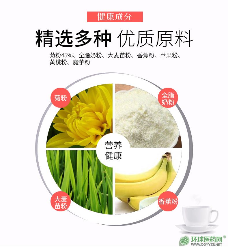 | 主要成分 | 全脂奶粉、黄桃粉、大麦苗粉、魔芋粉、菊粉、香蕉粉、苹果粉 |