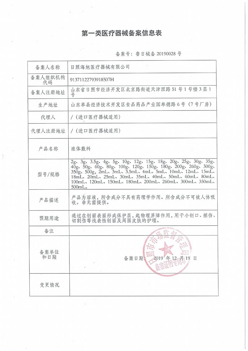 | 补充说明 | 【储运条件】密封、常温下贮存,冷藏后使用效果更佳;密封、常温下运输,运输过程中轻拿轻放。 【备案号】鲁日械备 20190028号 |