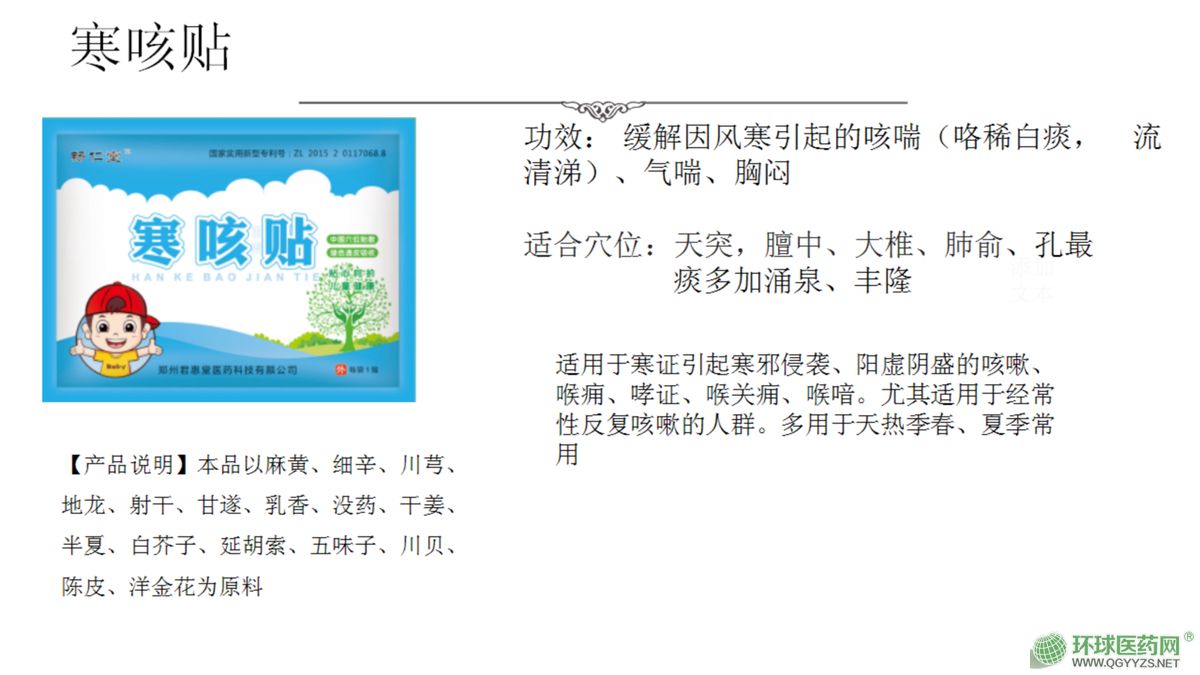 | 补充说明 | 1热咳保健贴:适用于热证引起热邪犯表、肺气失和所的咳嗽、喉痈、哮证、喉关痈、喉喑。尤其适用于经常性反复咳嗽的亚健康人群br2寒咳保健贴:适用于寒证引起寒邪侵袭、阳虚阴盛的咳嗽、喉痈、哮证、喉关痈、喉喑。尤其适用于经常性反复咳嗽的亚健康人群br3复合咳喘保健贴:适用于咳喘、咳嗽、咽痒、咽喉异物感、声哑失音、哮证、喉关痈、喉喑。尤其适用于经常性反复咳嗽的亚健康人群br4感冒保健贴:适用于感冒引起的鼻塞、流涕、喷嚏、鼻痒、头痛、咽痒、咽喉异物感、声哑失音、哮证、喉关痈、喉喑。尤其适用于经常性反复感冒的亚健康人群br5咽扁保健贴:适用于乳蛾引起的咳嗽、咽痒、咽喉异物感、声哑失音;哮证、喉痈、喉关痈、喉喑;尤其适用于经常性反复乳蛾的亚健康人群br6退热保健贴:适用于小儿因风寒、风热、内热、湿热引起发热的亚健康人群br7腹泻保健贴:适用于腹泻、腹部隐痛、肠鸣腹痛、便溏、纳差、神疲。大便有粘液、次数多、量大、大便异常的人群。尤其适用于经常性反复腹泻的亚健康人群br8健脾消食保健贴:适用于脾胃不和引起的不思饮食、消化不良、食少便溏、食积、脾胃虚弱的亚健康人群br9肠胃保健贴:适用温经通络、散寒止痛;疝气偏坠,胃寒腹胀、腹痛,小胎寒,积聚痞块;尤其适用于肠胃紊乱的亚健康人群br10润肠通便保健贴:适用于便秘的亚健康人群br11减肥保健贴:适用于肥胖的亚健康人群br12颈肩腰腿疼保健贴:适用于风寒湿痹所致的肌肉疼痛、颈椎疼痛、腰椎疼痛、四肢关节疼痛、寒湿引起**疼痛不适的人群;尤其适用颈肩腰腿疼的亚健康人群br |