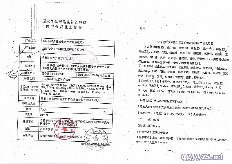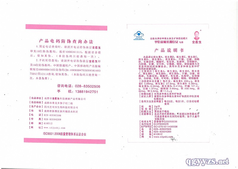 | 品牌名称 | 金医生牌多种维生素及矿物质咀嚼片 |