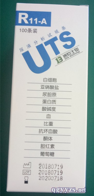 | 产品用途 | R11-A尿液分析试纸检验项目:白细胞、亚硝酸盐、尿胆原、蛋白质、PH、比重、抗坏血酸、酮体、胆红素、葡萄糖 R11-A尿液分析试纸检验项目:博特BT-500型尿液分析仪 R11尿液分析试纸检验项目:白细胞、亚硝酸盐、尿胆原、蛋白质、PH、比重、抗坏血酸、酮体、胆红素、葡萄糖 R11尿液分析试纸检验项目:适用于博特BT200、MAC120、凯达KCF-100、宝威-200型尿液分析仪 尿液分析试纸条用途是进行尿液检查分析,为临床筛选糖代谢、肾功能、肝功能、酸碱代谢平衡障碍以及尿路感染等疾病提供信息,适合医院、诊所进行尿液常规分析。 尿液分析试纸条可用于肾功能异常及糖尿病引起的肾损伤,严重感染,肝胆功能异常等疾病的过筛检测。 |