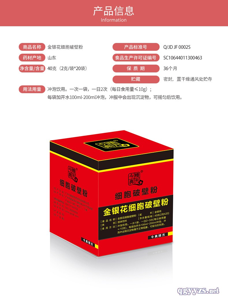 | 用法用量 | 1、冲泡饮用。 2、一次1袋,一日2次。 3、本品采用先进的低温细胞破壁技术,制备过程中全程采用低温制造,*大程度保留了金银花的有效活性成份。 4、金银花细胞破壁粉冲服中出现的少量沉淀物为全成份中的脂溶性有效成份,可摇匀后饮用。 |