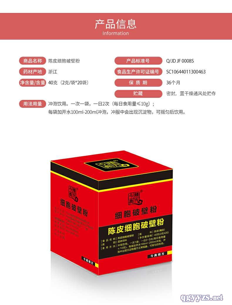 | 补充说明 | 陈皮,中药名。为芸香科植物橘及其栽培变种的干燥成熟果皮。以陈久者为佳,故称陈皮。产广东新会者称新会皮、广陈皮。具有理气健脾,燥湿化痰的功效。主治脾胃气滞证,呕吐,呃逆,湿痰,寒痰咳嗽,胸痹。 陈皮既是重要的调味品,也是一味重要的理气健脾药,在日常中被广泛的应用于烹饪及养生保健。 低门槛贴牌代加工 1、通过低温破壁技术确保细胞水溶性和脂溶性成分全保留。 2、细胞破壁粉进入人体内有效成分吸收率高。 3、采用微波低温干燥灭菌技术,不添加任 何辅料。 4、十万级gmp车间生产,无菌环境。 5、采用指纹图谱技术,全生产链控制产品质量(即原料、中 间品、成品检测),确保每批产品质量均一、可控。 6、产品质量控制指标包括含量、重金属、农残留物、二氧化 硫、黄曲霉毒素、微生物等检测项目。 7、今典精方对细胞破壁粉的植物分子化学结构进行定性、 定量 8、今典精方制定细胞破壁粉重金属检测项目 细胞破壁粉重金属检测项目包括:铜(cu)、铅(pb)、 镉(cd)、砷(as)、汞(hg)。 9、今典精方制定细胞破壁粉农药残留检测项目 农药残留检测项目包括:滴滴涕、六六六、五氯硝基 苯、六氯苯、七氯、艾试剂、氯丹。 |