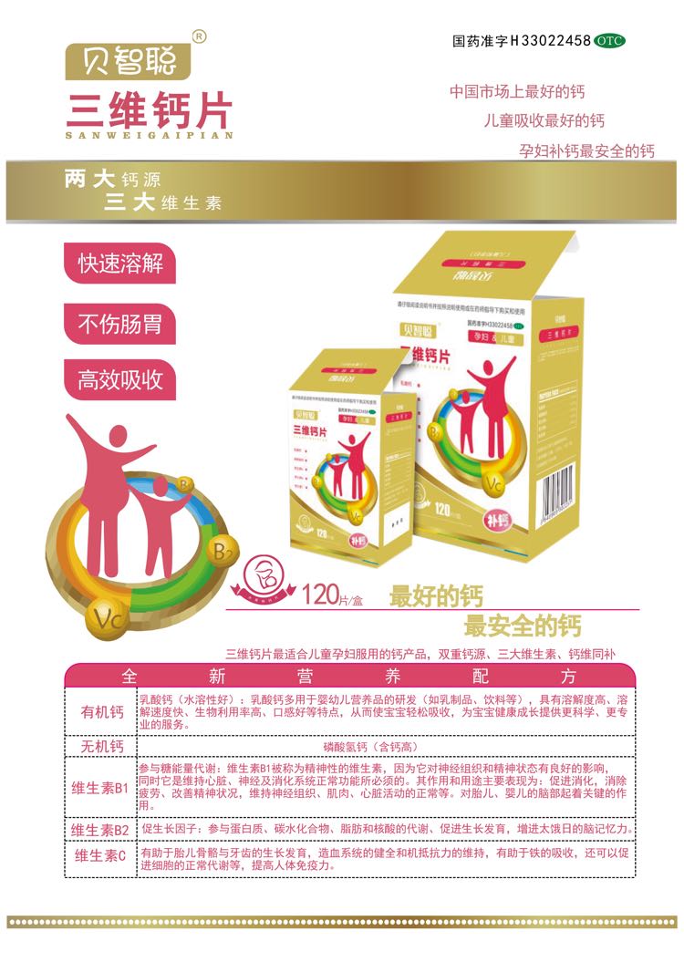 | 产品卖点 | 《贝智聪三维钙片》三大优势: 一、产品优势 ◆富含乳酸钙、磷酸氢钙两大钙源以及三大维生素(VB1.VB2.VC);钙维同补,全新配方,黄金搭配(维生素本身可以和钙质产品协同作用,相对于单纯补钙来说,服用后益处更大更容易吸收) ◆精选优质乳酸钙钙源,杜绝碳酸钙吸收率低,结石易上火的特点,国药准字(预防+治疗),**可靠 ◆浓缩型小钙片,咀嚼片,水果味,口感好 |