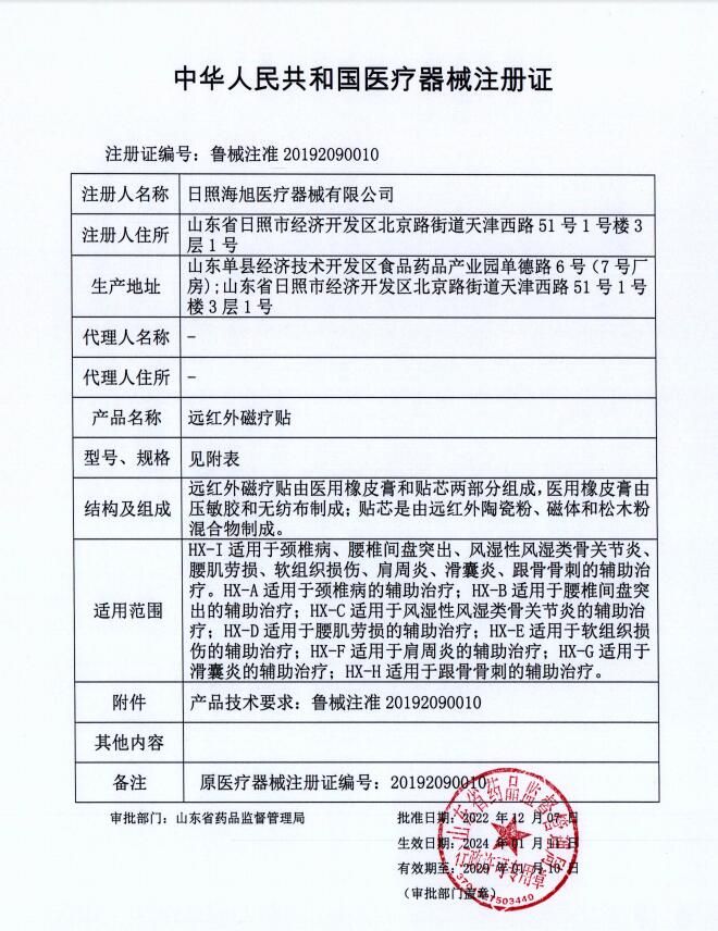 | 补充说明 | 膏药贴牌OEM加工产品(磁疗贴)技术参数:剥离强度≥1N/cm,持粘性≤2.5mm,远红外发射波长范围8μm~15μm,法向比辐射率不小于80%,磁感应强度不小于85mT。 |