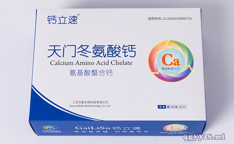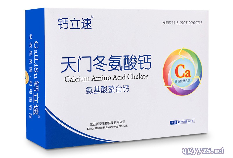 | 补充说明 | 【产品名称】钙立速 天门冬氨酸钙 纳米氨基酸螯合钙 【产品规格】1.5克*40条/盒 【适宜人群】适用于缺乏钙元素的人群。 【使用方法】将本品添加温开水或粥、汤、饮料等中服用。 【招商企业】三亚百泰生物科技有限公司 螯合钙是生物活性有机钙,比重为0.12,经过美国弗吉尼亚大学和香港科技大学检测鉴定为分子型钙源!螯合钙的高吸收率是传统钙剂的3倍!由于传统钙含有无机钙,而无机钙只有通过维生素D才能促进钙与蛋白酶结合,因此其它钙产品都需要添加维生素D。而螯合钙是氨基酸和钙的完全螯合物,故无需添加任何促进钙吸收的物质就可被人体直接吸收。 钙立速作为第三代具有生物活性的新型有机钙源,具有无以伦比的巨大优势: 一、水溶性好——能迅速溶于水,溶解度为食用碳酸钙的400倍; 二、生物活性高——不需要消化,人体直接吸收; 三、吸收率高——美国弗吉尼亚大学结论是吸收率95%以上; 四、服用**——不需补充维生素D3,避免维生素过量服用引起副作用; 胃肠环境没有钙离子,避免结石的可能; 整体被吸收,避免酸根离子对消化道酸碱度的影响; 五、钙沉积速度*快——对骨骼有特殊的亲和力,骨的存留率是其它组织的七倍多。 螯合是一种生产技术,这个词的意思为蟹爪,螯合物就像蟹钳一样,钳住矿物质。氨基酸螯合钙,每两个氨基酸分子与一个钙离子通过螯合技术,将其螯合在一起,通过小肠黏膜的氨基酸通道将钙及其他的矿物质吸收入血*,这样做的目的主要是提高矿物质的吸收利用率,其特点是能有效地提高人体骨密度,具有稳定的钙源结构,能直接被肠道微膜吸收,重量轻、易溶解、易吸收、无需添加VD,吸收率高,补钙排铅、****,有效解决了传统钙源溶解性差、吸收率低、副作用大、产生结石等问题。 |