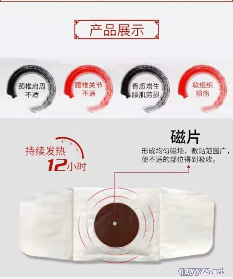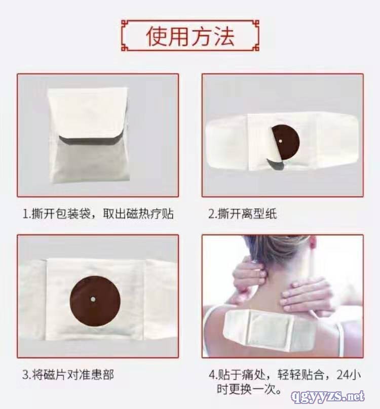 | 使用方法 | 清洁患处,确认包装无破损后,打开包装,取出磁热疗贴,将贴剂的隔离膜撕去,贴于患处,每24小时更换一次。 |