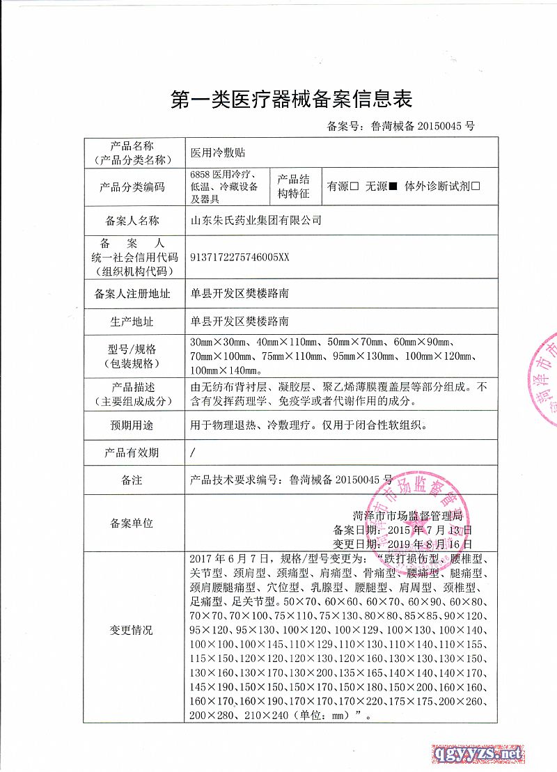 | 补充说明 | 山东朱氏药业集团有限公司有几十种一类、二类械字号文号,现有产品也有上百种,合作客户也是遍布全国各地,膏药贴剂、保健食品、高端化妆品系列全国招商,我们为了扩大市场,与更多客户合作,也希望有新型外用产品规格定制加工要求、贴牌加工的客户联系吴总:15253166614。我们给您专业的医用冷敷贴产品和服务。 |