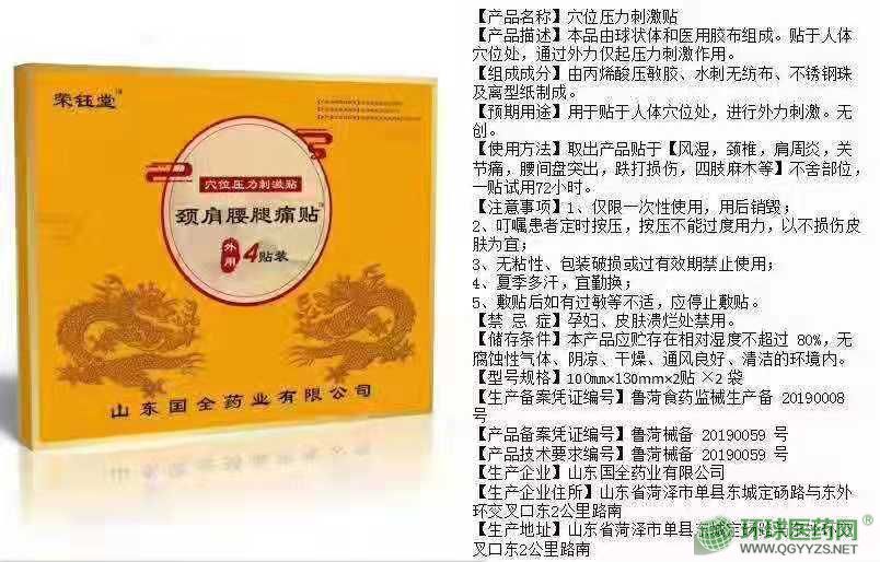 | 补充说明 | 【产品类型】 其他 【批准文号】 鲁菏械备 20190058 号 【包装规格】 120mm×160mm×4贴 ×2 袋 【生产厂家】 山东国全药业有限公司 【主要成份】 由无纺布背衬层,凝胶层,聚乙烯薄膜覆盖层等部分组 成。 【招商区域】 全国 【使用方法】 沿易撕口撕开包装袋,取出医用冷敷贴,揭去薄膜,将 凝胶面贴于患处。每片可持续使用 72 时。 【功能主治】 用于物理退热,冷敷理疗。仅用于闭合性软组织。 |