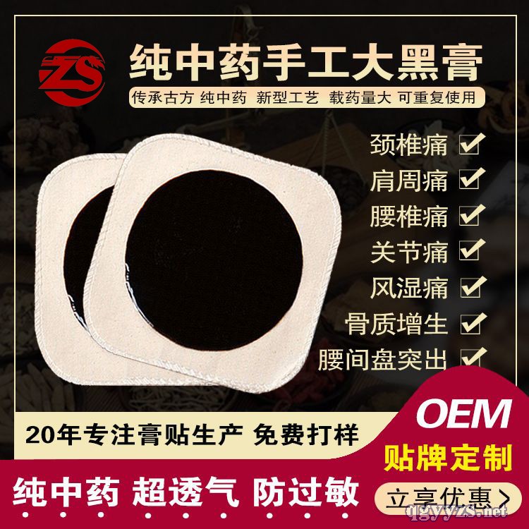 | 产品用途 | 山东皇圣堂药业有限公司膏药生产厂家现面向全国承接黑膏药医用冷敷贴贴牌加工业务。皇圣堂黑膏药运用中医贴敷疗法透皮技术,通过贴于体表的膏药刺激末梢神经,进而反射扩张血管,促进局部血液循环,激活细胞组织,松弛血管平滑肌,增强血管自身节律性运动的作用,从而改善周围组织营养,产生消炎、止痛、活血化瘀、通经走络、开窍透骨、祛风除湿、防止复发的治疗目的。同时黑膏药医用冷敷贴中的药物机制在患处通过皮肤渗透达皮下组织,在局部产生药物浓的相对优势,从而发挥较强的药理作用。 |