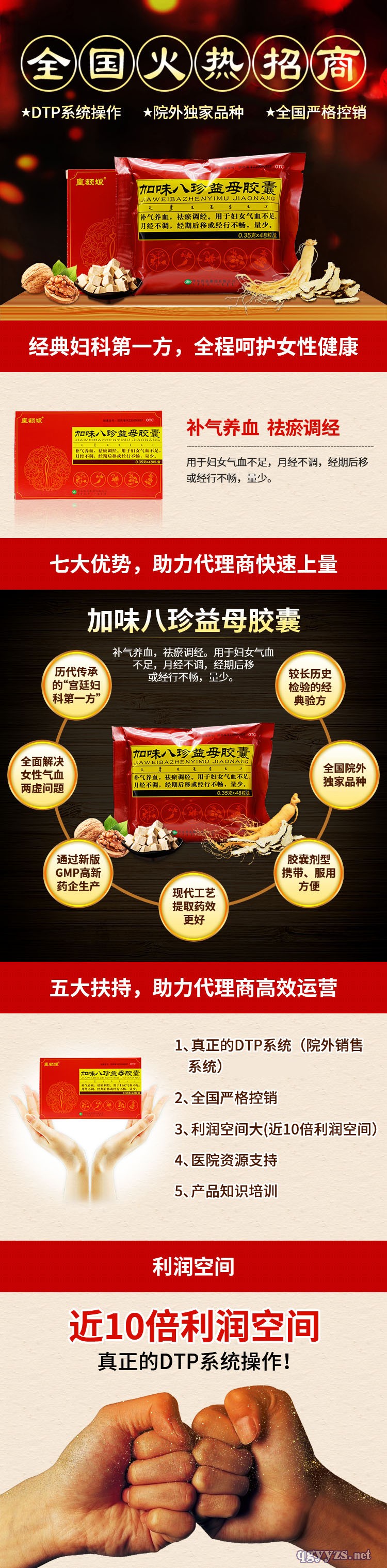 | 产品卖点 | ①全国优质产品 ②历代传承的“**妇科**方” ③**解决女性气血两虚问题 ④全程呵护女性美丽健康 ⑤胶囊剂型携带、服用方便 |