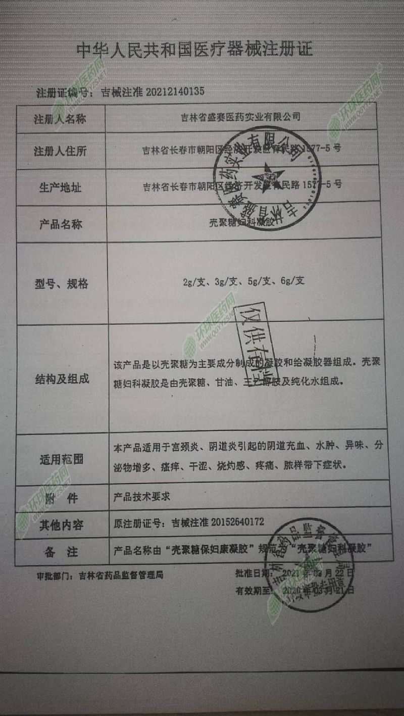 | 主要成分 | 该产品是以壳聚糖为主要成分制成的凝胶和给凝胶器组成。壳聚糖保妇康凝胶是由壳聚糖、甘油、三乙醇胺及纯化水组成。 |