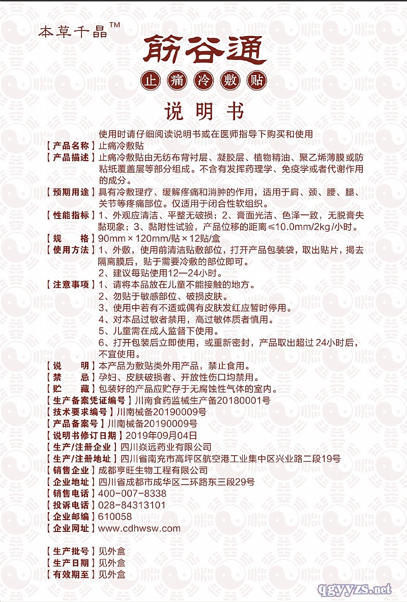 | 补充说明 | 1、道医配方、高浓缩。 2、不含激素、不伤皮肤。 3、止痛快、发热持久。 4、每贴都可重复使用。 5、国家批准的“止痛”冷敷贴。 6、外观应清洁、平整无破损;膏面光洁、色泽一致、无脱膏失黏现象;黏附性试验,产品位移的距离≤10.0mm/2KG/小时。 7、包装说明严格按国家规定,通过国家机构严格检测并备案;证件齐备。 |