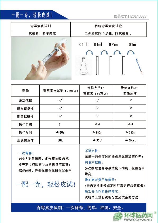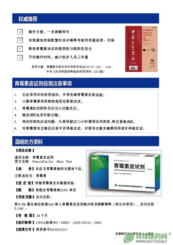 | 产品卖点 | CFDA批准**用于青霉素类药物皮试专用品; 全国优质,医保乙类; 标准规范,快捷准确; |