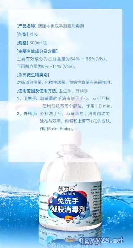 | 补充说明 | 【使用范围及使用方法】卫生手、外科手。 1、卫生手:取适量的手消毒剂于手心,双手互搓使均匀涂布 每个部位,作用 1.0 min。 2、外科手:外科洗手后,取适量的手消毒剂均匀涂布于双手、 前臂和上臂下1/3的皮肤,作用3min~5min。 【注意事项】外用消毒剂,不得口服,置于儿童不易触及处。 避免与拮抗药物同用。过敏者慎用。易燃者,远离火源。避光、 密封、防潮,置于阴凉、干燥处保存。开瓶用后应将盖拧紧, 有效期内使用。 |
