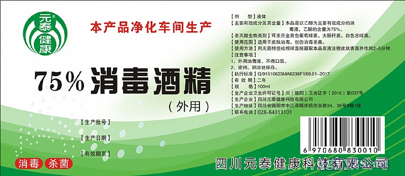 | 补充说明 | 主要成份:本品是以乙醇为主要有效成份的消毒液,乙醇的含量为75%。 使用范围:可杀灭金黄色葡萄球菌、大肠杆菌、白色念球菌。 使用方法:用无菌棉签或棉球直接蘸取本品原液涂擦皮肤表面或喷雾到皮肤表面并作用2-5分钟。 |
