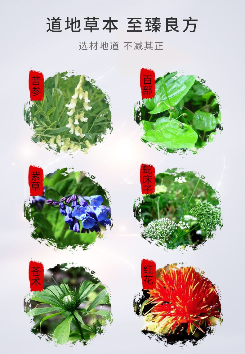 | 主要成分 | 苦参、百部、蝉蜕、大皂角、羚羊角、黄柏、紫草、大黄、蛇床子、苍术、防风、白鲜皮、红花、地骨皮、黄连、人工牛黄、五加皮、白矾、硫磺、冰片、薄荷脑、醋酸氯已定。 |