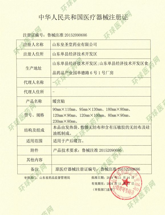 | 补充说明 | 【结构性能】皇圣堂暖宫贴由内装物和外袋组成,外袋由敷膜无纺布和含有压敏胶的无纺布及硅油纸制成。 【适用人群】顺产、剖腹产、痛经及流产后的女性。 【禁忌症】皮肤病、糖尿病、急性期炎症患者、孕妇下腹部、皮肤溃烂处禁用。 【贮存】密闭、置阴凉干燥处保存。 【执行标准】YZB/鲁0072-2007 【生产许可】鲁食药监械生产许20140114号 【生产】山东皇圣堂药业有限公司 使用方法 使用注意事项 1、孕妇、糖尿病和有血液循环障碍者、皮肤热敏感度低者、严重急性期炎症患者禁用 2、外用,一次性使用。 3、打开内袋后应立即使用,使用中若感觉过热,可适当加以隔垫,谨防烫伤。 4、睡时慎用,谨防无痛感的低温灼伤。 |