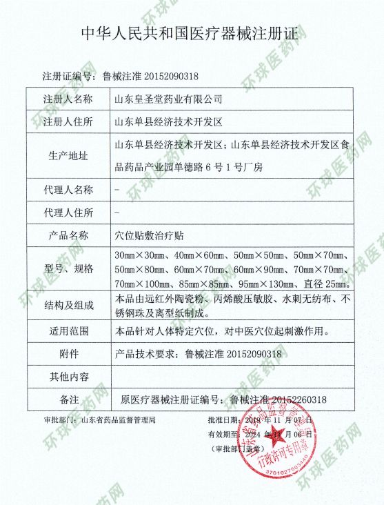 | 补充说明 | 【主要结构】本品由远红外陶瓷粉、丙烯酸压敏胶、水刺无纺布、不锈钢珠及离型纸制成。穴位贴敷治疗贴的压敏胶布剥离强度不小于1.0N/cm,持粘性应不大于2.5mm。远红外发射波长范围8μm-15μm,法相比辐射率≥75%。 【禁忌症】孕妇、皮肤溃烂处禁用。 【贮存】本产品应贮存在相对湿度不超过80%,无腐烂性气体,阴凉、干燥、通风良好、干净的环境内。 【产品技术要求】鲁械注准20152260318 【生产证许可】鲁食药监械生产许20140114号 【注册证编号】鲁械注准20152260318 【生产单位】山东皇圣堂药业有限公司 【生产地址】山东单县经济技术开发区 【有效期】两年 |