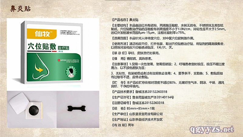 | 作用机理 | 1、剂型独特:鼻通贴+大椎穴相结合,产品剂型独特。 2、包装(套盒+穴位):套盒包装高端大气上档次,摆在柜台醒目,有穴位提示,渠道广泛,可走终端连锁,诊所,医院等。 3、效果**:中药剂型,含药量足,针对鼻炎、鼻窦炎等有明显的效果。 4、中医理论:大椎穴(重要穴位)在鼻炎等病症中起主导作用,大椎穴结合鼻通贴,治疗效果明显,多穴位给药。 |