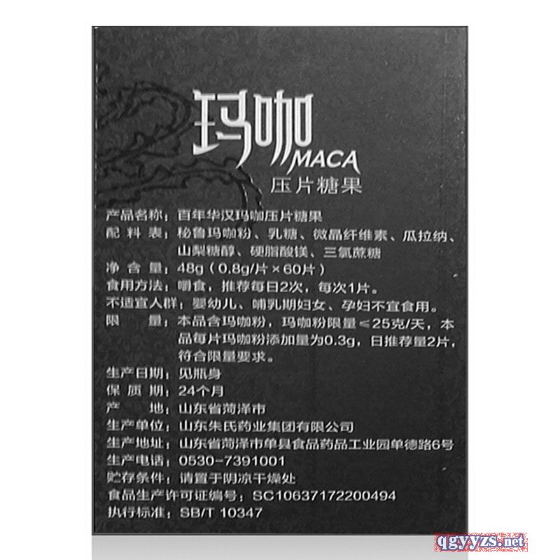 | 主要成分 | 乳糖、玛咖粉、微晶纤维素、山梨糖醇、三氯蔗糖、硬脂酸镁 |