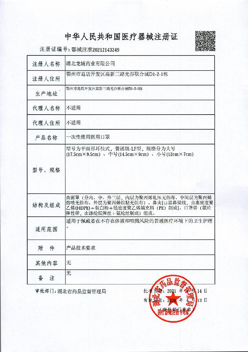 | 主要成分 | 本产品由口罩体,鼻夹和口罩带组成。口罩体外层和里层为无纺布,夹层为熔吸无纺布口置带为涤纶松紧带:鼻夹为金属铝条制成,产品以非无菌形式提供。 |