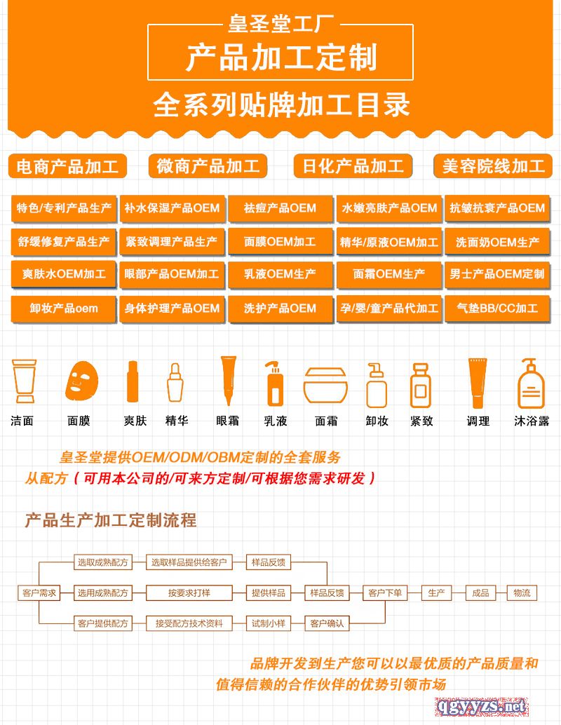 | 产品卖点 | 皇圣堂是专业化妆品OEM/ODM/OBM公司,补水面膜代加工生产厂家,具备完整的洁面乳、化妆水、精华素、乳液、膏霜、膜贴、膜粉、防晒、粉底、精油、洗护类产品生产线,在产品开发、生产管理、质量管理、产品策划、客户服务等方面拥有一批高素质的管理人才。欢迎各界前来咨询、洽谈!!! |