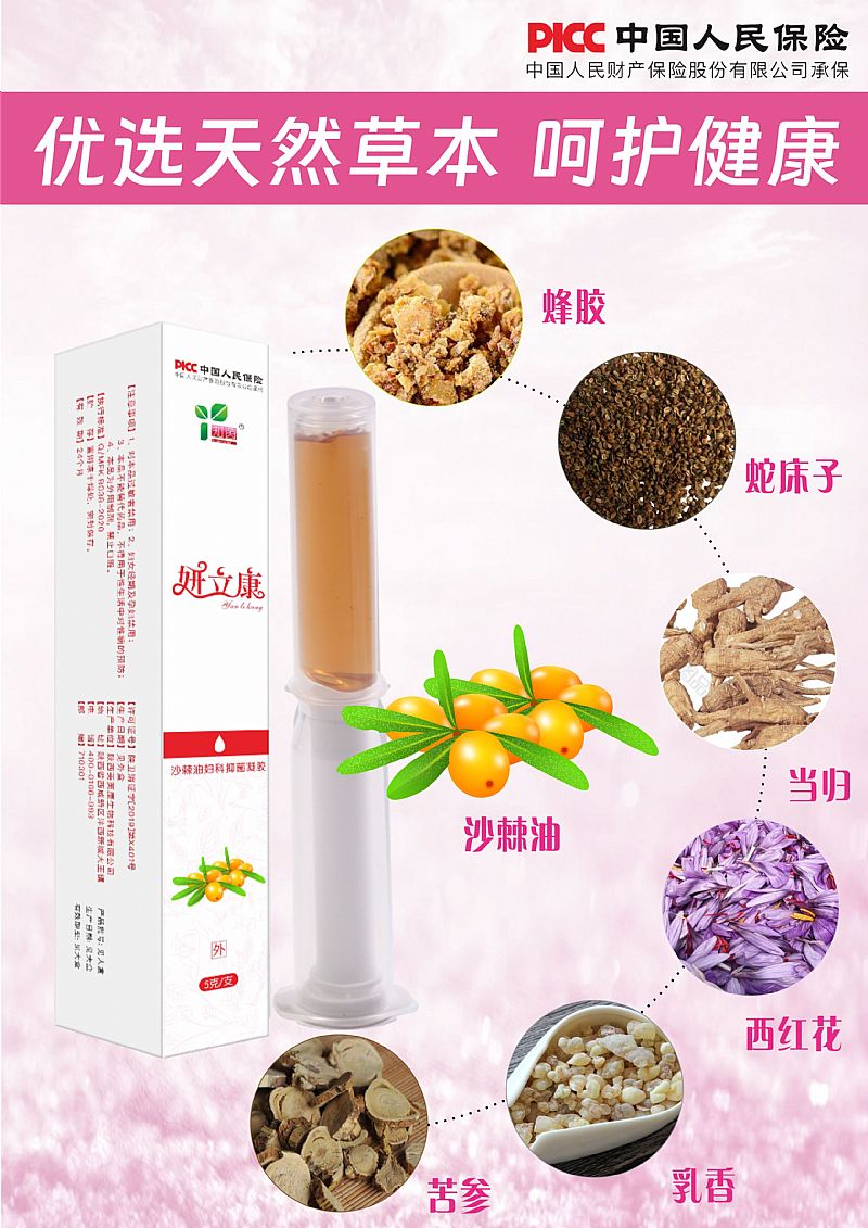 | 主要成分 | 沙棘油提取、蜂胶、金银花提取、蛇床子提取物、苦参提取物、乳香提取物、西红花提取物、当归提取物、冰片。 |