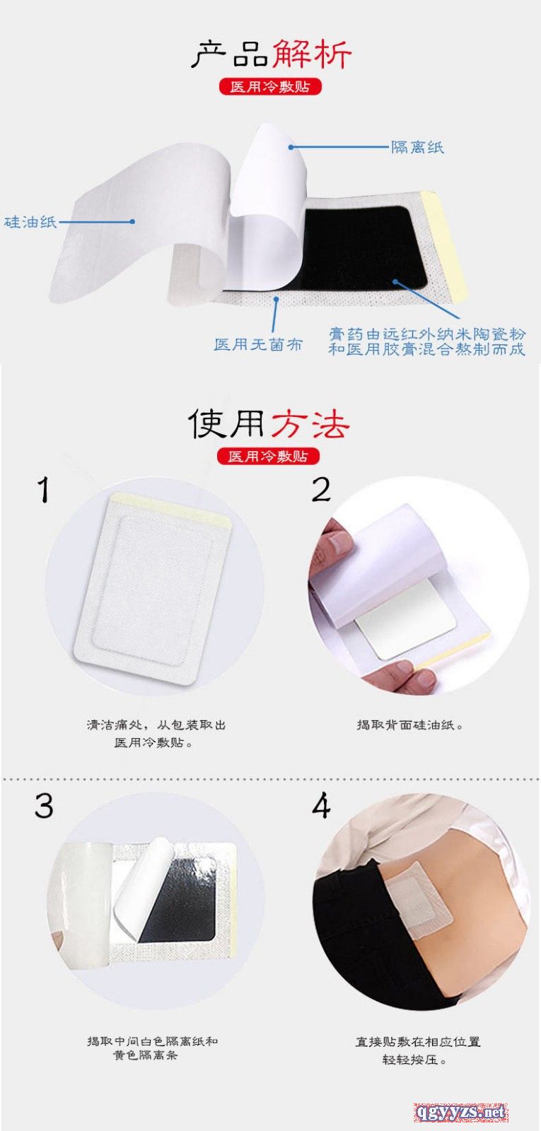 | 使用方法 | 清洁患处,确认包装无损后,打开包装,取出医用冷敷贴, 将贴剂的隔离膜撕去,贴于患处,每12小时更换一次。 |