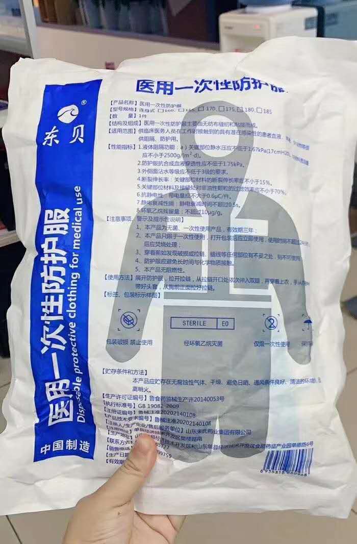 | 补充说明 | 【注意事项,警示及提示性说明】 1,本产品为无函、一次性使用产品,有效期三年; 2、本产品只限于一次性使用,打开包装后应立即使用,使用时间不超过24小时,用 后应焚烧处理。 3,穿着前如发现破损或拉链、缝线等任何部位有不妥之处,则不可使用 4,防护报应避免长时间与化学物质按触。 5、本产品无阻燃性。 |