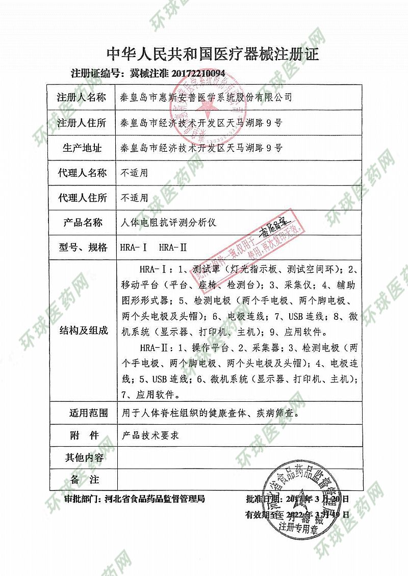 | 补充说明 | 传统的常规体检和HRA检测的区别是什么 常规体检主要包括医生的检查、化验、超声、CT、X线、核磁、胃镜、肠镜等多钟检查相结合,主要针对的是已经形成的疾病检测,提供的信息仅仅是有病和无病,在早期预防阶段功效并不明显。常规体检远远满足不了健康管理的要求,更满足不了人们对疾病防范于未然的迫切需求。HRA系统专注于疾病的早期筛查,对全身各个脏器生物活性和生理功能的检测,预测潜在危险因素和疾病发展方向。 惠斯安普HRA健康管理系统可提供的报告 《HRA健康风险评估报告》、《人体生物电指标》、《健康风险提示》、《治疗建议》、《饮食建议》。 |