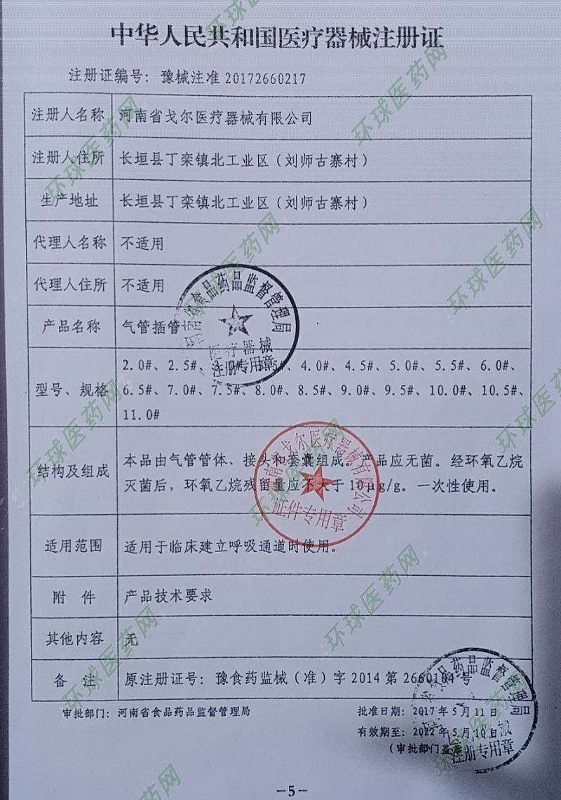 | 补充说明 | 气管插管使用说明 名称:气管插管 型号规格:2.0#、2.5#、3.0#、3.5#、4.0#、4.5#、5.0#、5.5#、6.0#、6.5#、7.0#、7.5#、8.0#、8.5#、9.0#、9.5#、10.0#、10.5#、11.0# 结构组成:本品由气管管体、接头和套囊组成。 适用范围:适用与临床建立呼吸通道时使用。 适应症: 1.自主呼吸突然停止者。 2.不能满足机体的通气和氧气供应需要而需机械通气者。 3.不能自主清除上呼吸道分泌物、胃内容物反流或出血随时有误吸者。 4.存在上呼吸道损伤、狭窄、阻塞等影响正常通气者。 5.中枢性或周围性呼吸衰竭者。 注意事项: 1.插管操作中必须轻柔,选择导管的大小以能容易通过声门裂为度,太粗或暴力插入易致喉、气管损伤,太细则不利于呼吸。 2.导管**通过声门后再深入5~6cm,使套囊**越过声门,不要误入一侧支气管或食管。 3.套囊充气以恰好封闭导管与气管壁间隙为度,勿盲目注射大量空气而造成气管壁缺血坏死。 4.放置好手术体位后应试行气管内吸引,并检查导管是否通畅。 生产单位:河南省戈尔医疗器械有限公司 生产地址:河南省长垣县丁栾镇北工业区 联系电话:0373-8976668 移动电话:156038000062 Email:geeryiliao@163.com |