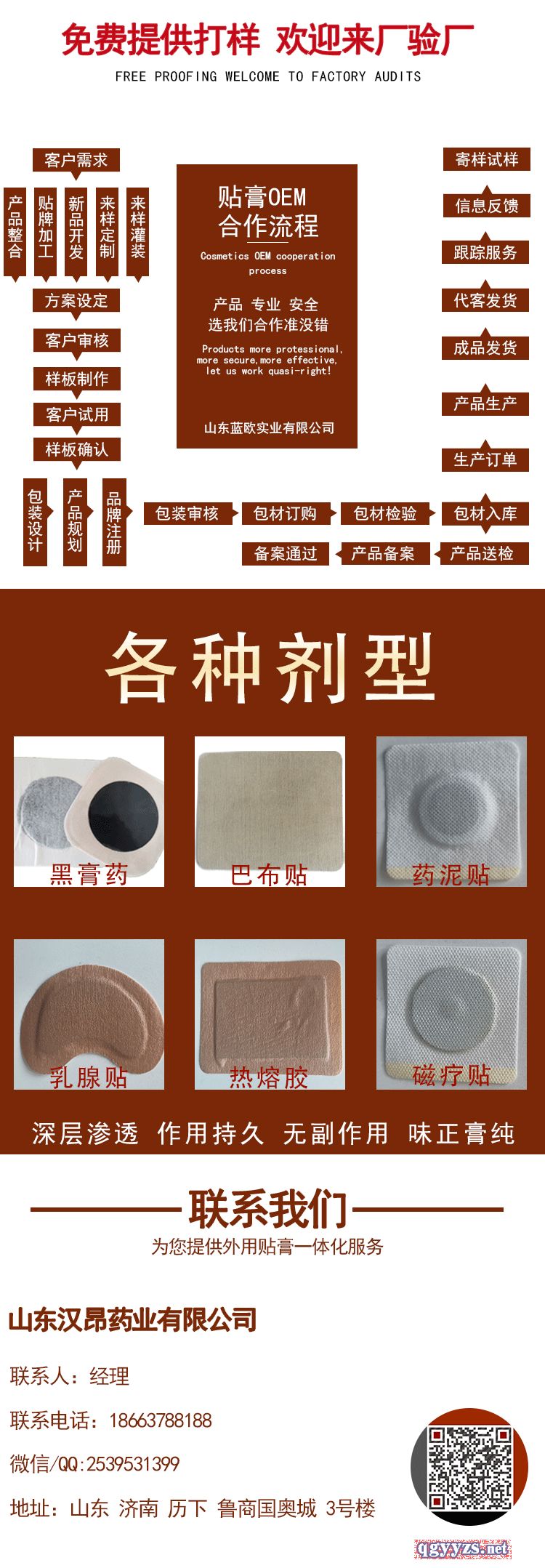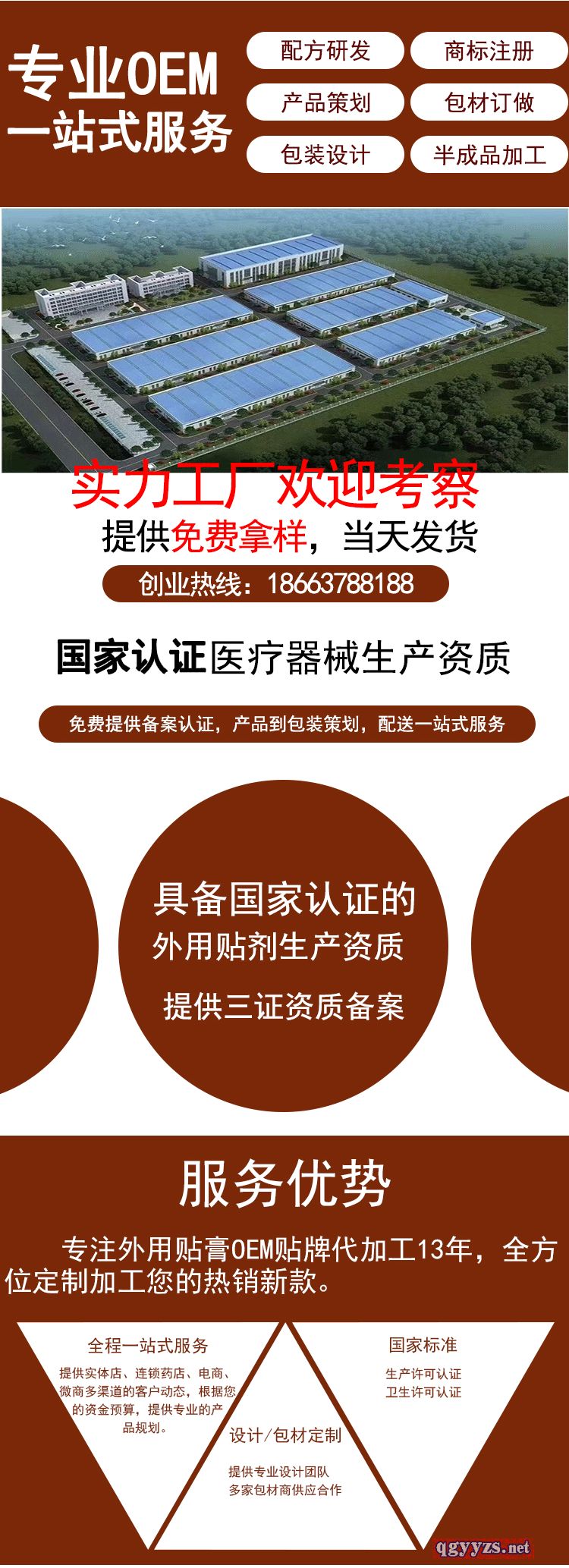 [主营产品]:一类械字号加工工厂 一类械字号贴牌 膏药加工工厂 贴剂加工工厂 贴膏加工工厂 膏贴加工工厂 喷剂加工 更多>