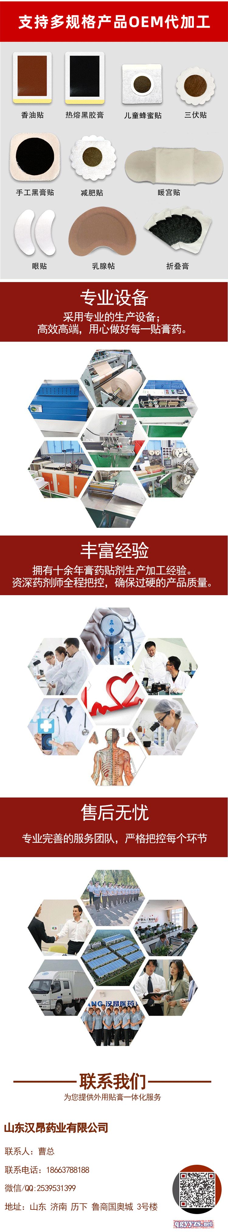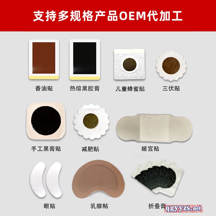 | 作用机理 | ·产品涵盖:膏药、发热贴、磁疗贴、静电理疗贴、肚脐贴、足疗贴、退热贴、暖贴、眼贴、穴位贴等; ·布种类:无纺布、弹力布、水刺布、防粘布、纯棉布等; ·价格说明:根据具体尺寸、布料、药芯、防渗膜、防渗圈等产品具体制作信息核算价格; ·产品优势:渗透好、自行发热、见效快、效果明显 |