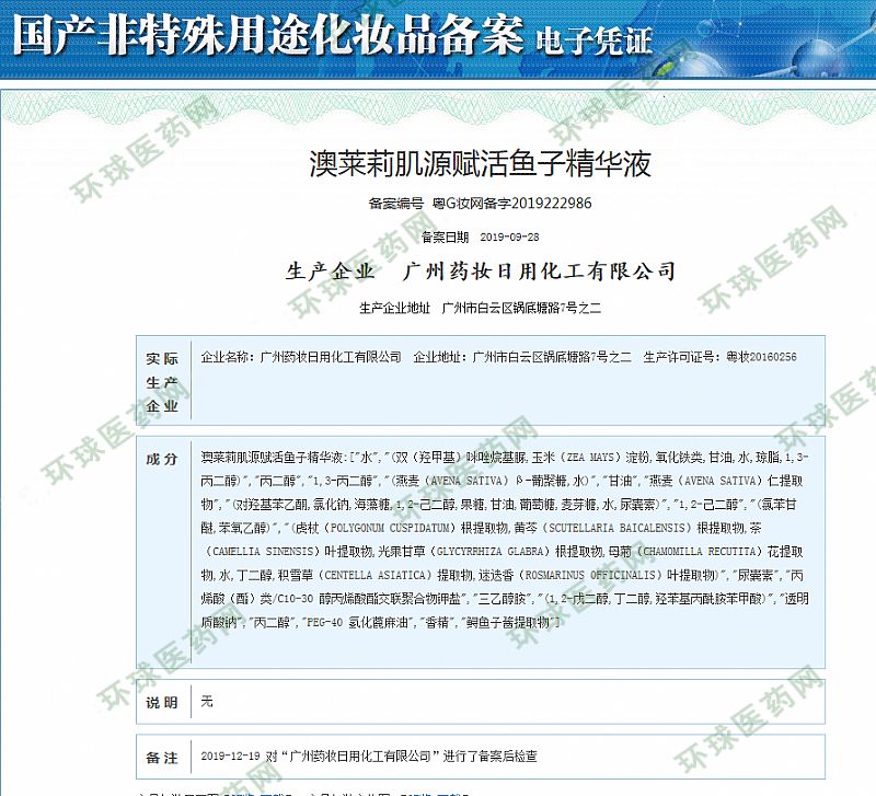 | 主要成分 | 澳莱莉肌源赋活鱼子精华液:["水","(双(,1,2-己二醇,果糖,甘油,葡萄糖,麦芽糖,水,尿囊素)","1,2-己二醇","(氯苯甘醚,苯氧乙醇)","(虎杖(POLYGONUMCUSPIDATUM)根提取物,黄芩(SCUTELLARIABAICALENSIS)根提取物,茶(CAMELLIASINENSIS)叶提取物,光果甘草(GLYCYRRHIZAGLABRA)根提取物,母菊(CHAMOMILLARECUTITA)花提取物,水,丁二醇,积雪草(CENTELLAASIATICA)提取物,迷迭香(ROSMARINUSOFFICINALIS)叶提取物)","尿囊素","丙三乙醇胺鲟鱼子酱提取物"] |