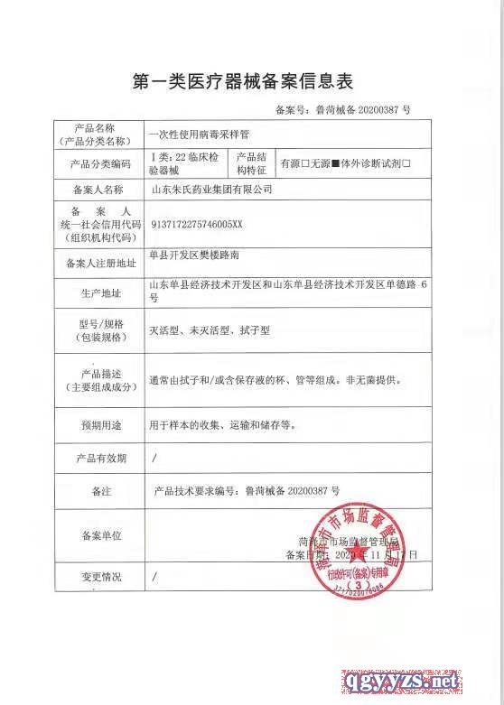 | 产品名称 | 一次性使用病毒采样管 |