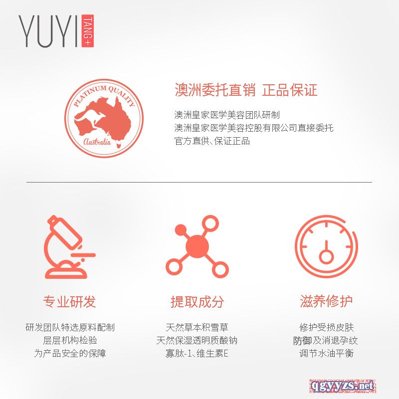 | 其它说明 | 来自于澳洲**医学美容团队研制,广袤的澳洲大陆有着纯净无污染的地理生态资源,是护肤品重要原料来源的主要国家之一。由研发团队特选亲肤温和的原料配制,通过层层机构检验,为YUYITANG产品提供有效的保障 |