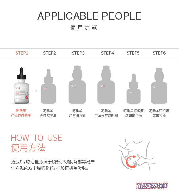 | 使用方法 | 洁肤后,取适量涂抹于腹部、大腿、臀部等易产生妊娠纹或干燥的部位,稍加按揉至吸收即可。 |