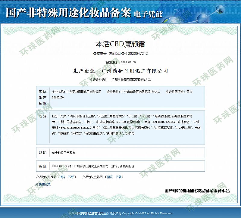 | 补充说明 | 本活CBD魔颜系列采用大麻叶提取物,大麻二酚是常用的大麻提取物。萃取大麻叶提取物,蛹虫草提取物,滨海当归叶茎提取物,积雪草提取物,紫玉兰花提取物,牛油果树果脂,霍霍巴油等,赋能无光肌肤,抚摸您的叛逆肌,不油不腻,滋润肌肤,随时随地补给肌肤水水滋润度 |