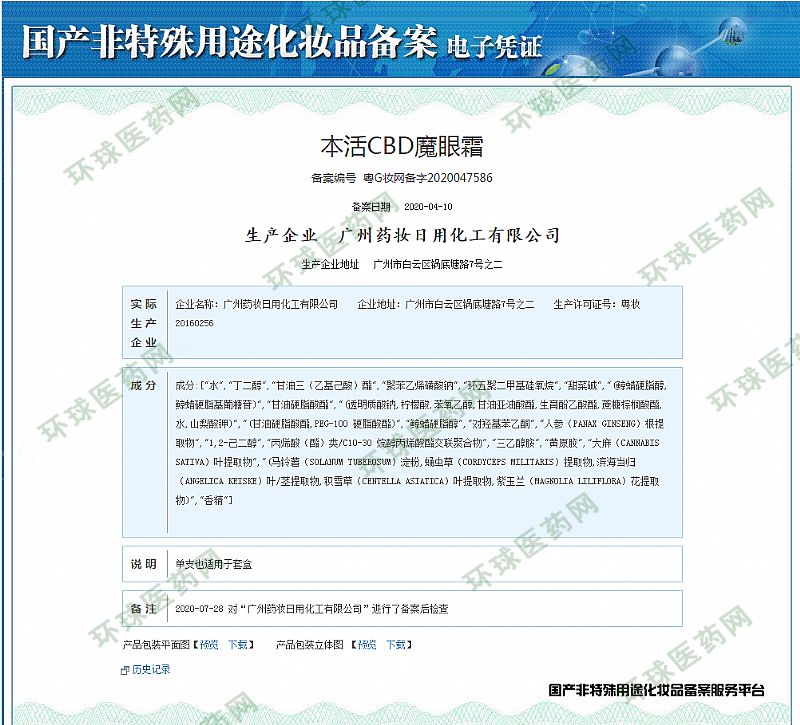 | 补充说明 | 本活CBD魔颜系列采用大麻叶提取物,大麻二酚是常用的大麻提取物。萃取大麻叶提取物,蛹虫草提取物,滨海当归叶茎提取物,积雪草提取物,紫玉兰花提取物,赋能无光肌肤,抚摸您的叛逆肌,不油不腻,滋润肌肤 |