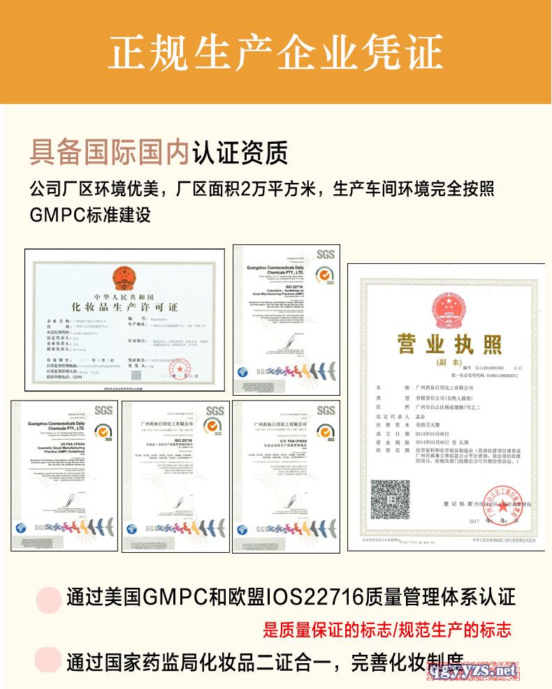 | 补充说明 | 广州**日用化工有限公司--是工商局注册的一家正规护肤品生产企业,多年来已经与澳大利亚皇家医学美容控股有限公司强强联手打造成为以科研,生产销售,品牌策划,OEM加工,国内外贸易服务的强大组合,一直致力于天然中草药植物护肤领域的研发,生产符合****标准化的化妆品。工厂拥有现化制造基地近2万平方米,拥有妆字号车间和消字号车间,引进国际*先进的德国专业生产设备,10万级净化车间,30万级包装车间,全套自动化生产线,利用先进的生产设备和雄厚的技术力量为依托,严格按照《化妆品生产许可105条检查要点》标准生产和管理,确保产品的品质。广州**汇集了中外药理学、中药学、植物学、化学工程学和精细化工等学科的专业研发人员,精心选择优质***原料以及*佳的配方组合方案,为生产*优质的产品奠定坚实的基础。 |