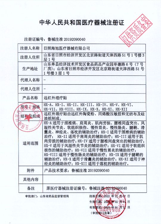 | 补充说明 | 远红外理疗贴 二类器械文号A、规格: 医保收费编号 远红外线:340100001 7cm×10cm×3 贴/袋×2 袋/盒×300 盒/件 B、注册证号: 鲁械注准 20192090040 C、特点: 1、远红外优化贴,新剂型,集巴布贴和黑膏药的优 势于一身 2、疗效好,见效快,远红外疗与药疗相结合,标本兼治 3、无过敏 4、耐汗,透气性好,夏季也可以正常使用 5、柔软舒适,不拔汗毛 6、包装色彩鲜明,抢眼 7、同类产品少,效价比高 |