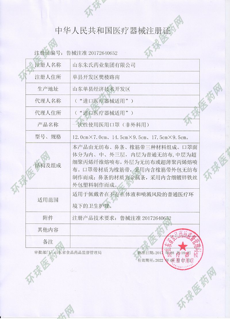 | 补充说明 | 【产品结构组成】本产品由口罩体,鼻夹和口罩带组成。 【产品材料】口罩体*外层和*里层为无纺布,夹层为熔喷无纺布;口罩带为涤纶松紧带;鼻夹为金属铝条制成;产品以非无菌形式提供。 【材质】共五层:*内层:无纺布第二层:熔喷无纺布第三层:熔喷无纺布第四层:热风棉第五层:无纺布 【灭菌要求】非无菌 |