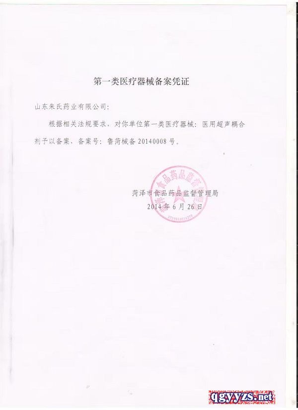 | 补充说明 | 它的PH值为中性,不易干燥,超声显像清晰,粘稠性适宜,无油腻性,探头易于滑动,可湿润皮肤;新一代医用耦合剂对于生产环境的更加严格,适用的范围也更广泛 【适用范围】供超声诊断适用,适用于超声仪器探头接触完整皮肤部位的消毒, |