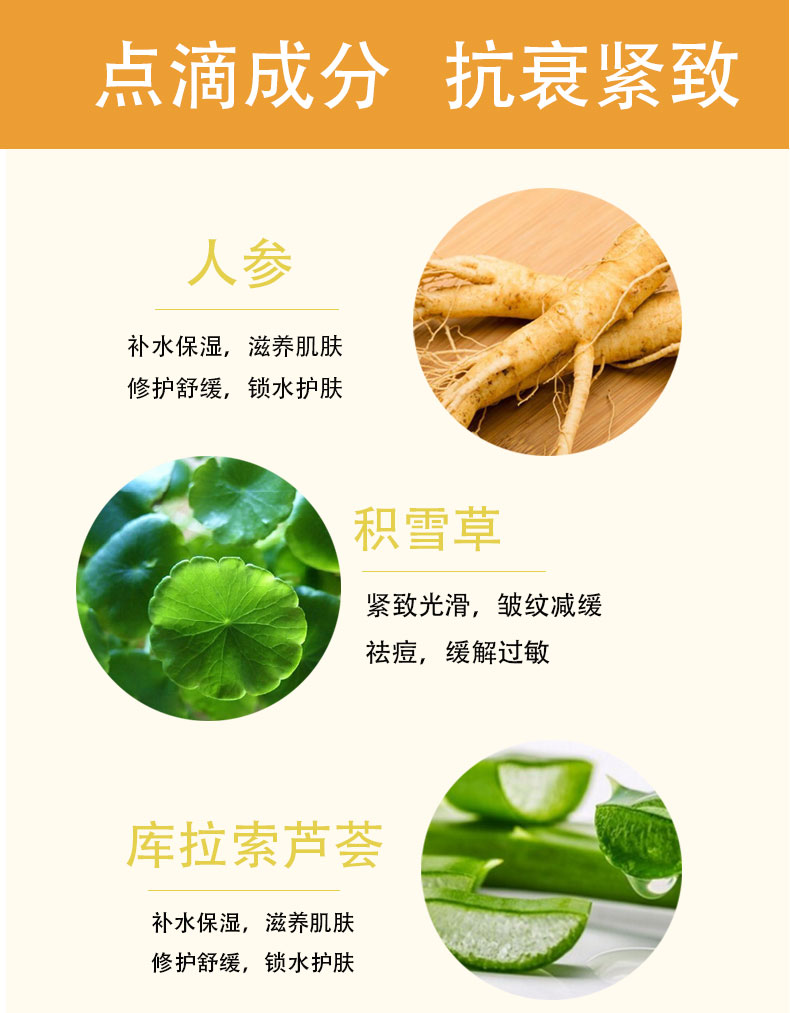 | 产品用途 | 轻抹间亲肤润泽,补水滋养,紧致毛孔,平抚细纹,丰沛水分提升肌肤保湿力与弹性质感,提拉紧致,触感弹润细腻,透现幼滑如初肌肤。 |