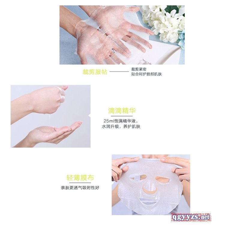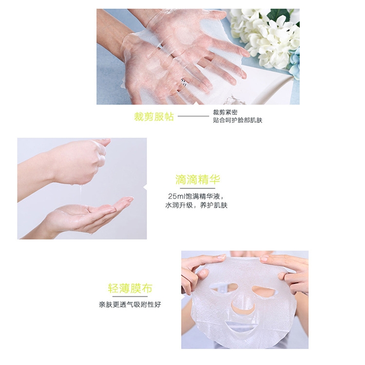 | 使用方法 | 洁面爽肤后,撕开铝膜袋,取下贴膜揭开白色珠光纸并将贴膜紧贴于脸部15-20分钟,清水洗净,接着后续保养即可。 |