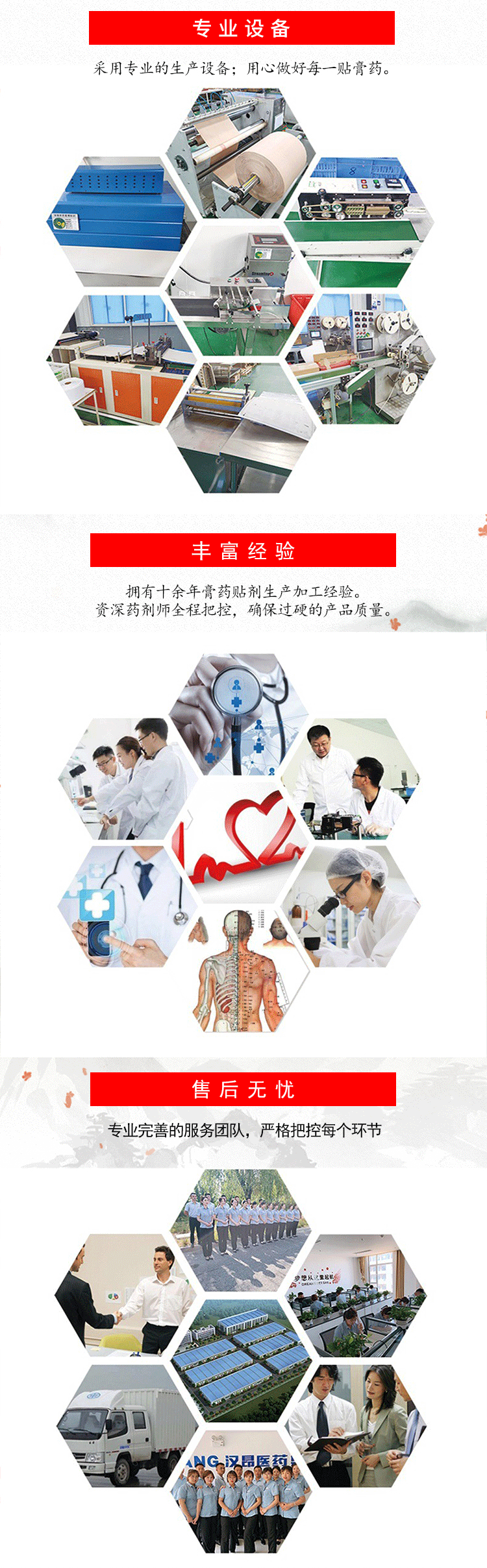 | 补充说明 | 膏药加工贴牌厂家工艺特点: 1、具有良好的透气性--有利于皮肤的自主呼吸 粘性可靠,低致敏,顺应性好,无残胶,不伤害皮肤,多带透气性,使皮肤能自由呼吸。 2、具有优越的抗拉性,抗刺穿性和抗撕裂性。 厚度薄,性能价格优,外观柔和,单面粘性好,涂以进口医用无敏胶,可贴于皮肤 3、自粘,方便,外观漂亮,抗过敏,不损皮肤。--膏药整体由无纺布、热熔胶和离型纸组成。根据客户需求可以加防渗膜、防渗圈。替代传统的牛皮纸膏药底布。 |
